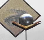 2013A combination of a tapestry and a glass sphere in a metal bracket that moves as ons passes it.